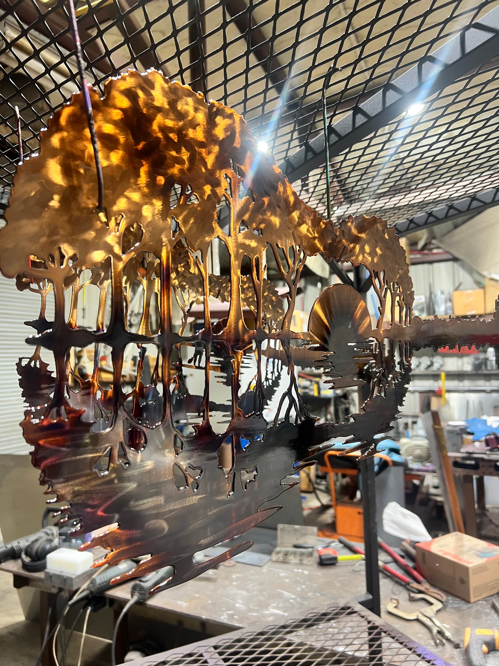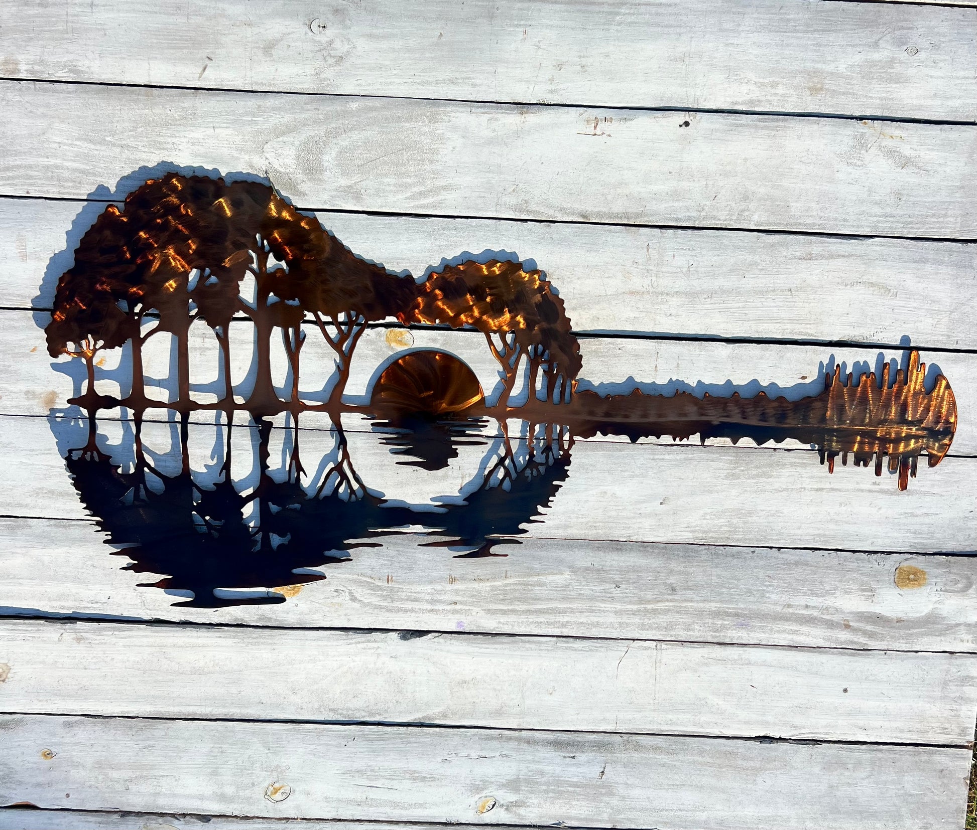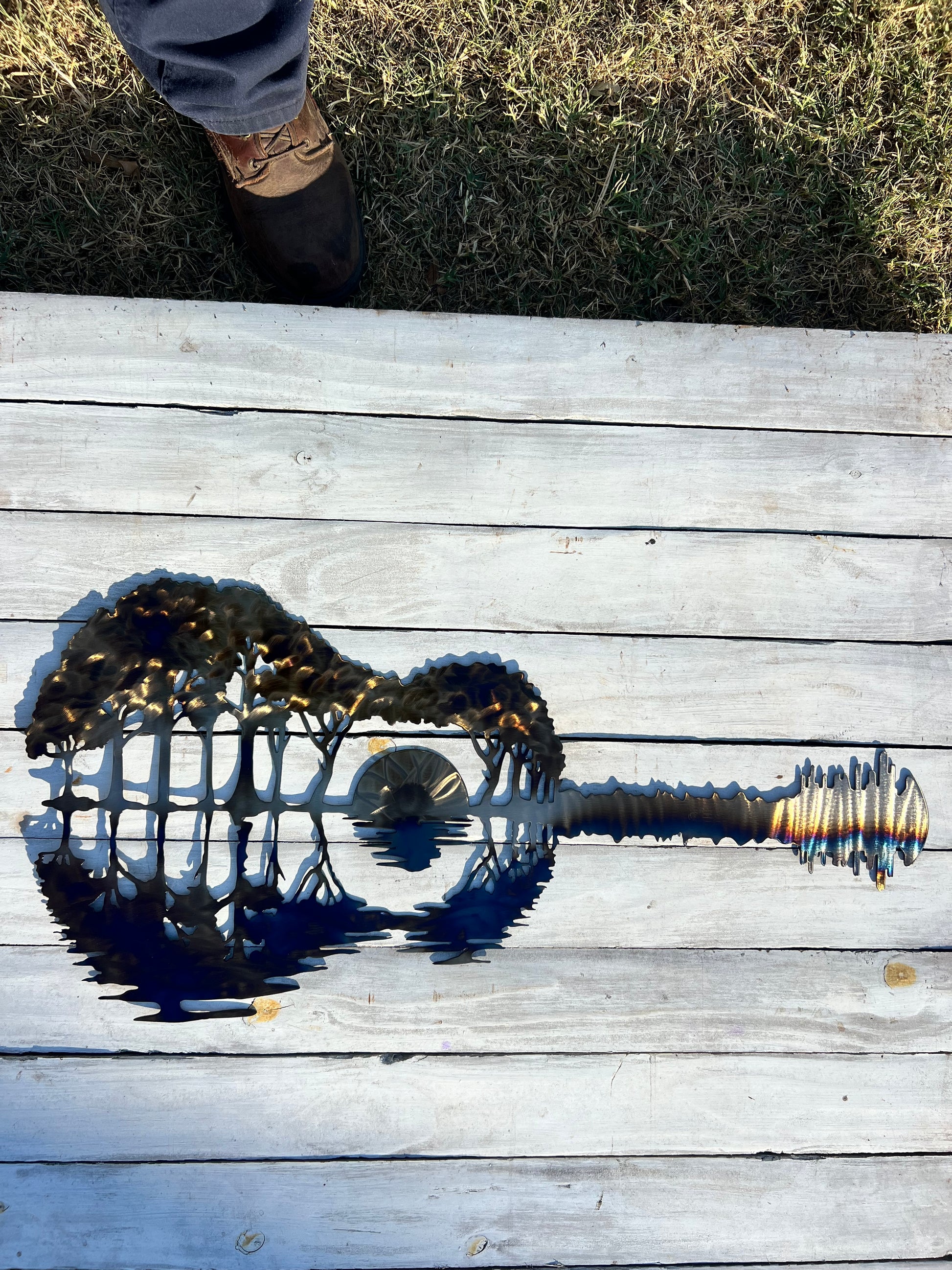 These guitars make wonderful center pieces for any room. Each one is unique in texture and color due to the grinding and heat coloring process. Measures 30” long